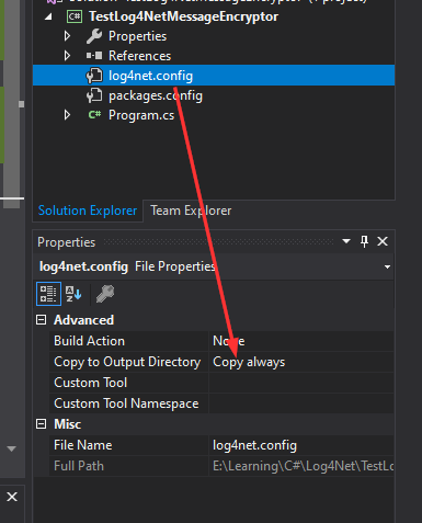 البته برای اینکه این کد کار کنه باید حتما فایل log4net.config با محتوایی که بالاتر گفتم کنار فایل اجرایی برنامه مون وجود داشته باشه. بنابراین اگه از طریق Visual Studio این فایل رو ایجاد کردیم باید یادمون باشه تو تنظیماتش Copy always رو بزنیم:
