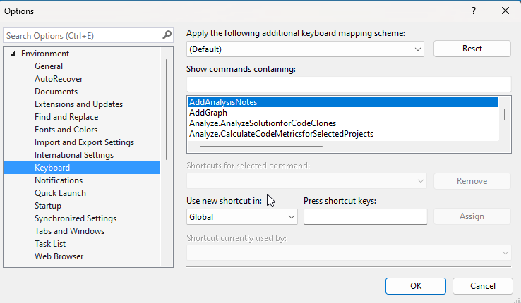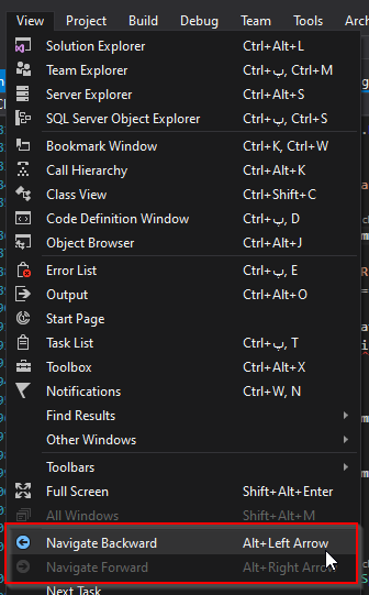 بعد میانبر مدنظرتون رو از لیست پیدا کنین (اگه نمیدونین اسم دقیقش چیه، اول توی کادر پایینی که نوشته press shortcut keys کلیک کنین و میانبر فعلی رو بزنین اون پایین توی کادر Shortcut currently used by d اسمشو میاره). بعد اینکه اسمشو توی لیست انتخاب کردین، توی کادر Press shortcut keys کلیک کنین و میانبر جدید رو از روی کیبورد فشار بدین، اگه درست ثبت شد روی گزینه Assign کلیک کنین تا توی کل محیط ویژوال استودیو تنظیم بشه. طبیعتا اگه بخواین فقط روی یه محیط خاص استفاده باشه باید قسمت Use new shortcut in رو تغییر بدین که بررسیش به عهده خواننده! فقط حواستون باشه که این میانبر جایگزین میانبر قبلی میشه. برای مثال من اومد Navigate Backward و Navigate forward که به صورت دیفالت رو Ctrl - و Ctrl Shift - بودن رو با Alt Left Arrow و Alt Right Arrow جایگزین کردم و نتیجه شد این: