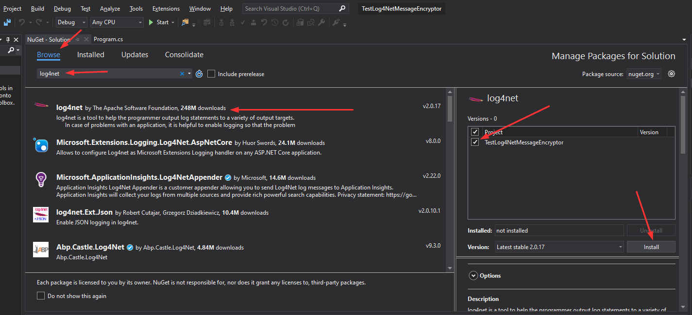 بعدش از سربرگ Browse سرچ میکنیم Log4net و بعد انتخاب کتابخونه مربوط به Apache، تیک پروژه یا پروژههایی که میخوایم از Log4.net داخلشون استفاده کنیم رو میزنیم و در آخر روی Install کلیک میکنیم تا نصب بشه (طبیعتا اینترنت باید وصل باشه برای این فرآیند).